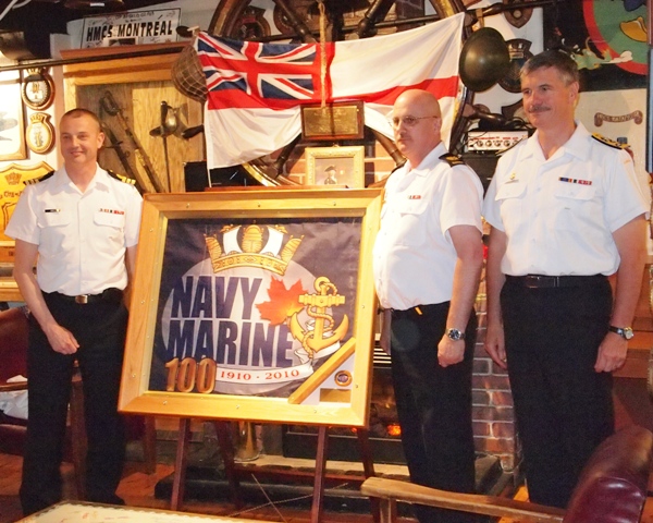 Following the meeting, Roger and Rhonda were invited to return to the club for a special presentation on 23 June. Vice-Admiral McFadden, Chief of Maritime Staff was at the Crownest from Ottawa to present a framed 100th Anniversary Flag from last years Centenary of the Canadian Navy. Mounted in the frame was also one of the 100th Anniversary medallions.