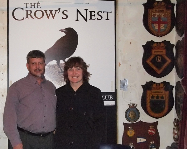 Roger and his wife Rhonda at the Crowsnest in St. John’s, NF. Behind them are just a few of the historic items from the officer’s of the RCN ships decorating the walls of the club.