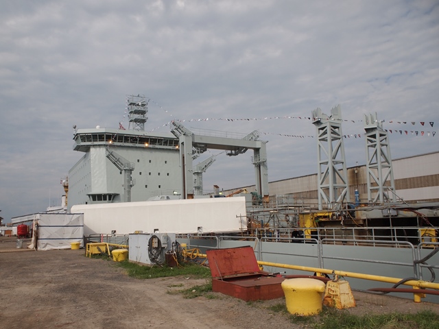 MV Asterix in dry dock at Chantier Davie Shipyards in Levis, PQ on 20 July 2017. With dry and liquid transfer masts, this AOR will be capable of supplying liquids and cargo to two ships simultaneously. Roger Litwiller Collection, courtesy Roger Litwiller. (RTL02794)